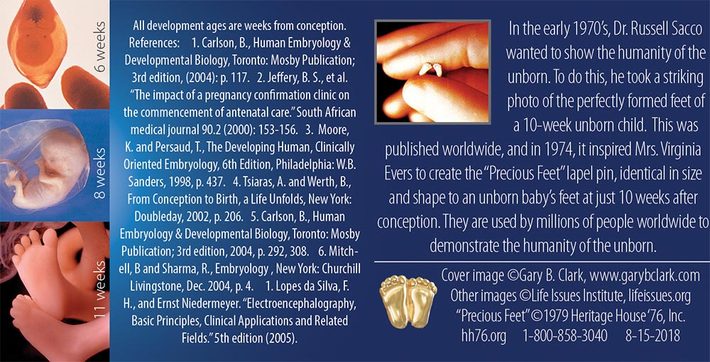 The Precious feet are fabulous. They have become the most recognized pro-life symbol there is. It's amazing how such a small item can have such a large impact. In addition, the information about the stages of development are very helpful.